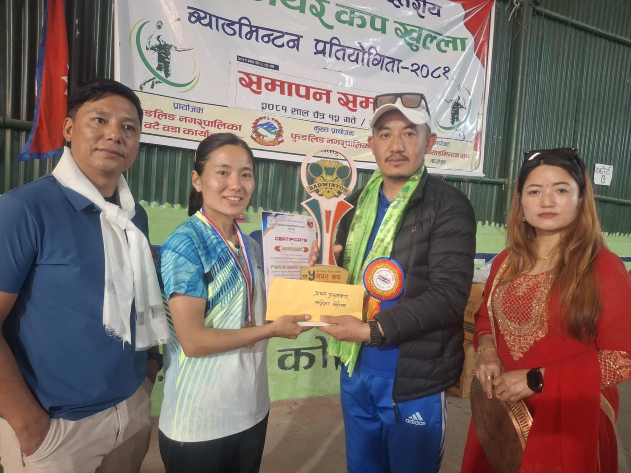 वुमन्स सिंगलतर्फ भावनादेवी केदेम प्रथम र सरुना गुरुङ दोश्रो भए । केदेमले गुरुङलाई २१–१४ र २१–८ को सहज जित दर्ता गरे । विजेताले १२ हजार र उपविजेताले ८ हजार ५ सयसहित ट्रफी मेडल र प्रमाणपत्र प्राप्त गरे ।