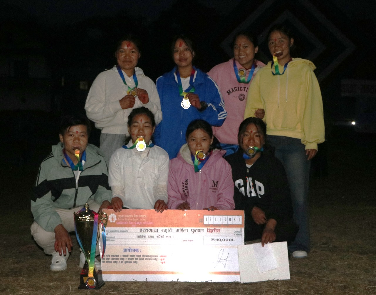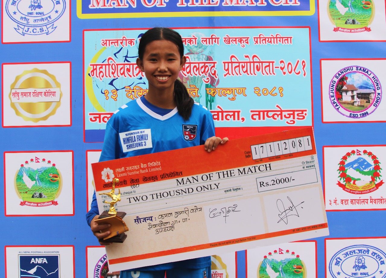 फागुन १८ गते । जिल्लाको मैवाखोला गाउँपालिकाको केन्द्र साँघुमा शनिबार सम्पन्न महिला फुटबल प्रतियोगीताको उपाधि मेन्छयायेम गाउँपालिका तेह्रथुमले जितेको छ । तेह्रथमुले मेरिङदेन गाउँपालिकालाई पराजित गरेको हो । दुवै टिमले निर्धारित समय गोलरहित बराबरी खेलेका थिए ।