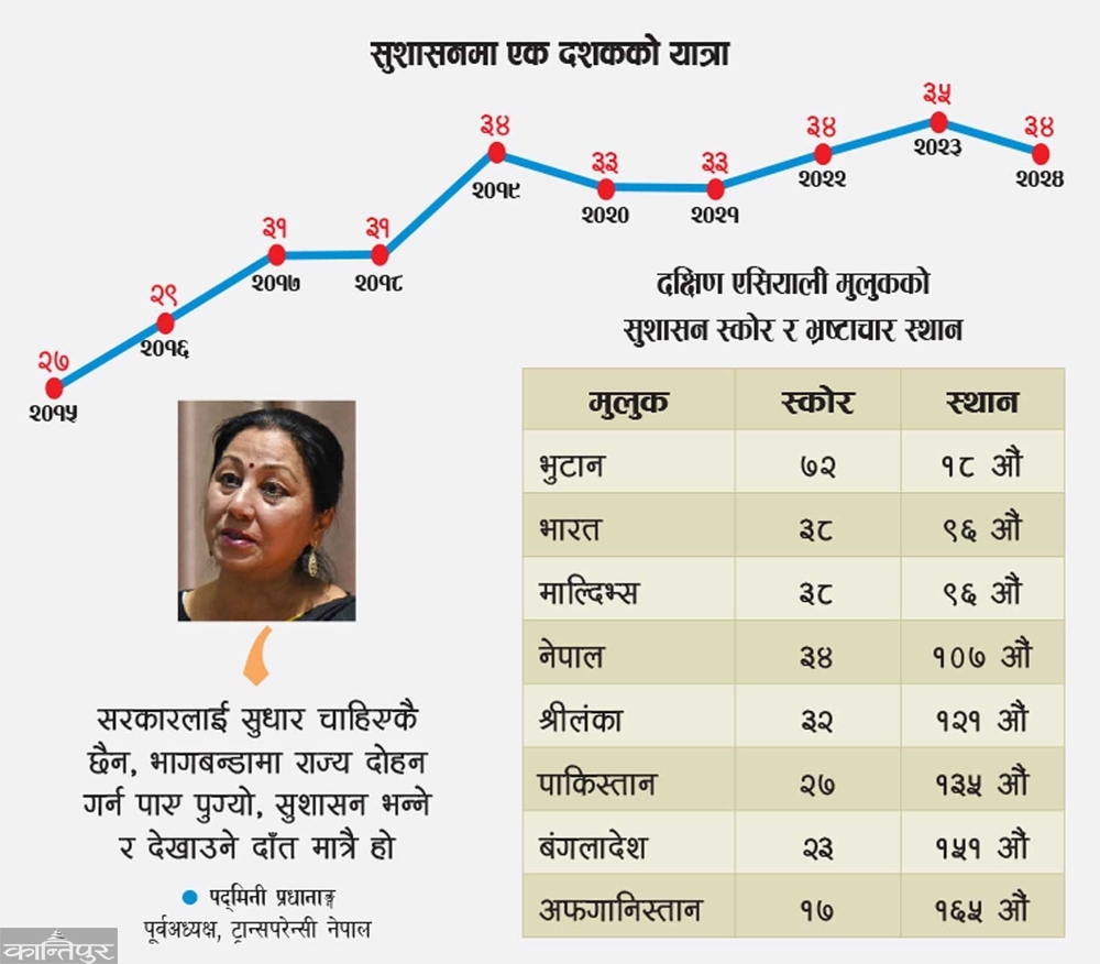 भ्रष्टाचार नियन्त्रण र सुशासन कायम गर्न राज्यका तीनवटै अंग कार्यपालिका, न्यायपालिका र व्यवस्थापिका उदासीन देखिँदा नेपालको अन्तर्राष्ट्रिय छवि निरन्तर ओरालो लागे