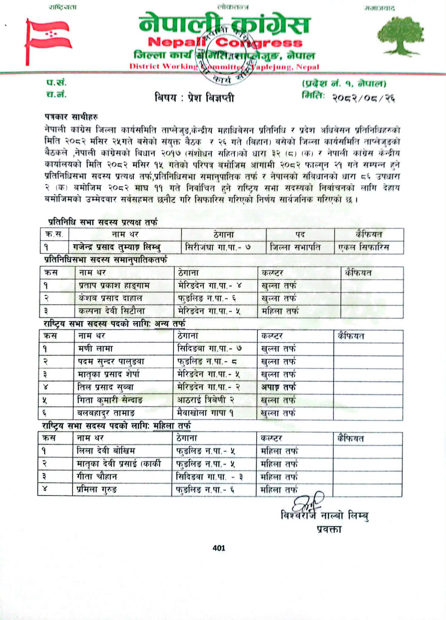 नेपाली काग्रेस ताप्लेजुङ सभापति गजेन्द्र प्रसाद तुम्याङलाई प्रतिनिधिसभाका (प्रत्यक्ष) लागि सिफारिस गरेको छ ।