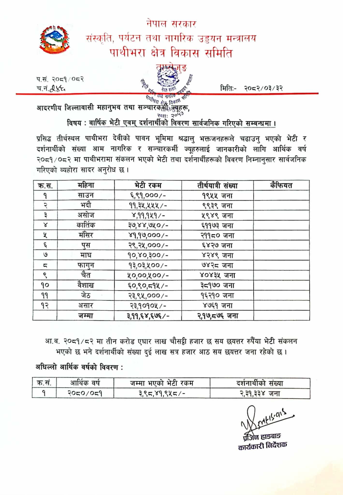 पाथीभरामा २ लाख १७ हजार दर्शनार्थी,३ करोड ११ लाख बढि भेटी संकलन