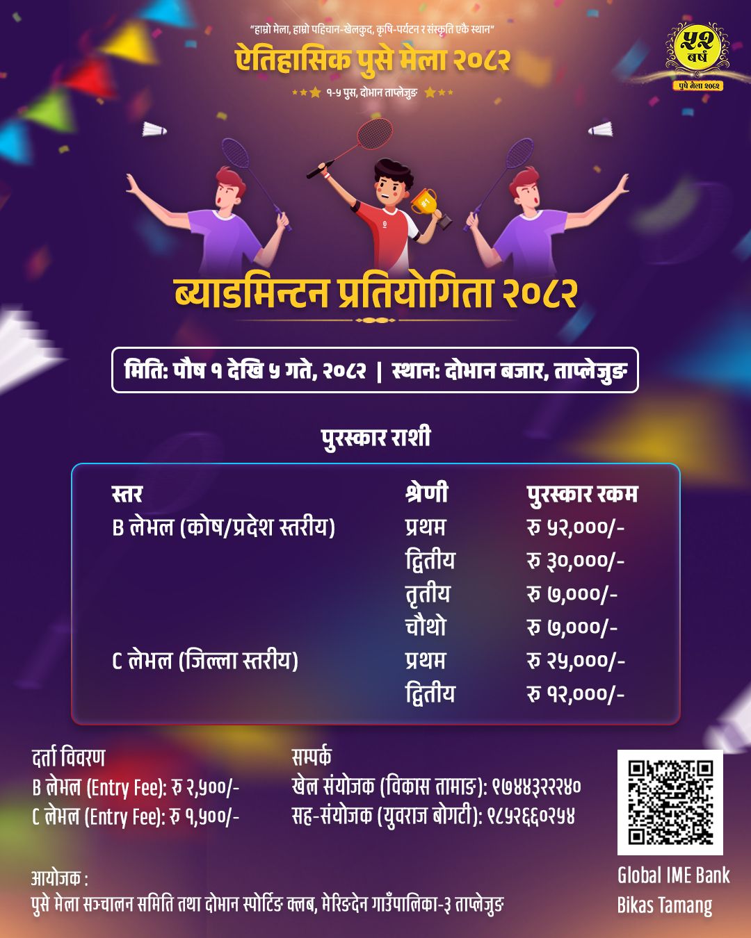 पुसे मेलामा ब्याडमिन्टनः प्रथम पुरस्कार बी लेभलमा ५२ हजार