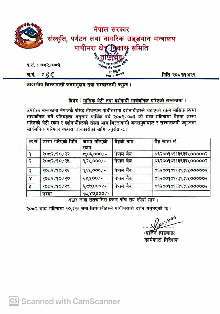 थीभरा क्षेत्र विकास समितिले माघ महिनामा दर्शनार्थीको संख्या र संकलन भएको रकम