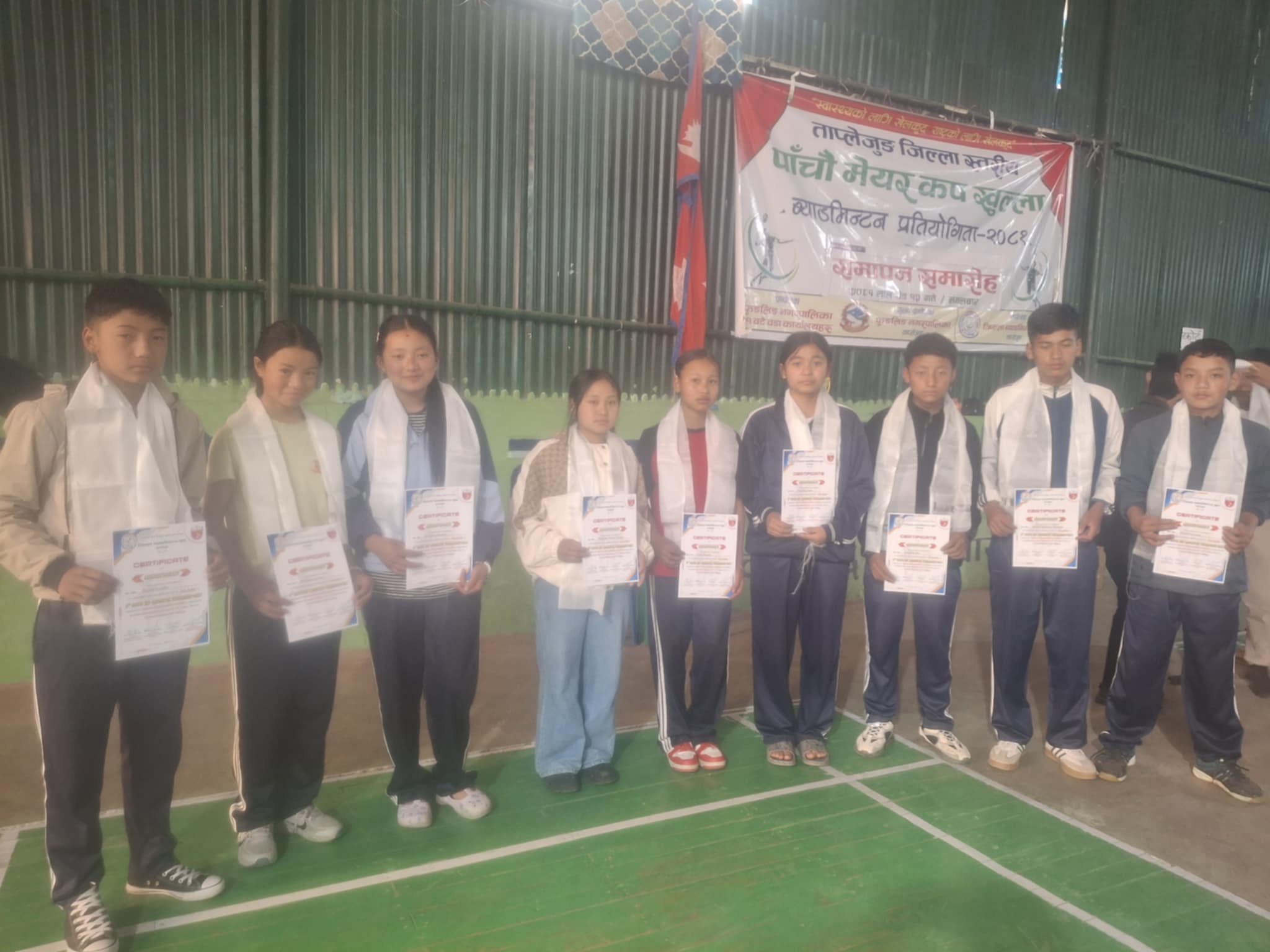चैत १३ गते । जिल्लाको फुङलिङ नगरपालिका ६ स्थित इन्द्रेणी ब्याडमिन्टन हलमा मंगलबार पाँचौ मेयर कप ब्याडमिन्टन प्रतियोगीता सम्पन्न भएको छ । ८ वटा विधा थियो । चैत ९ गतदेखि १२ गतेसम्म भएको खेलमा खेलाडी र दर्शकको उपस्थिति विगतको तुलनामा निकै नै बढि रह्यो । अधिकाँश खेल प्रतिस्पर्धात्मक थियो ।