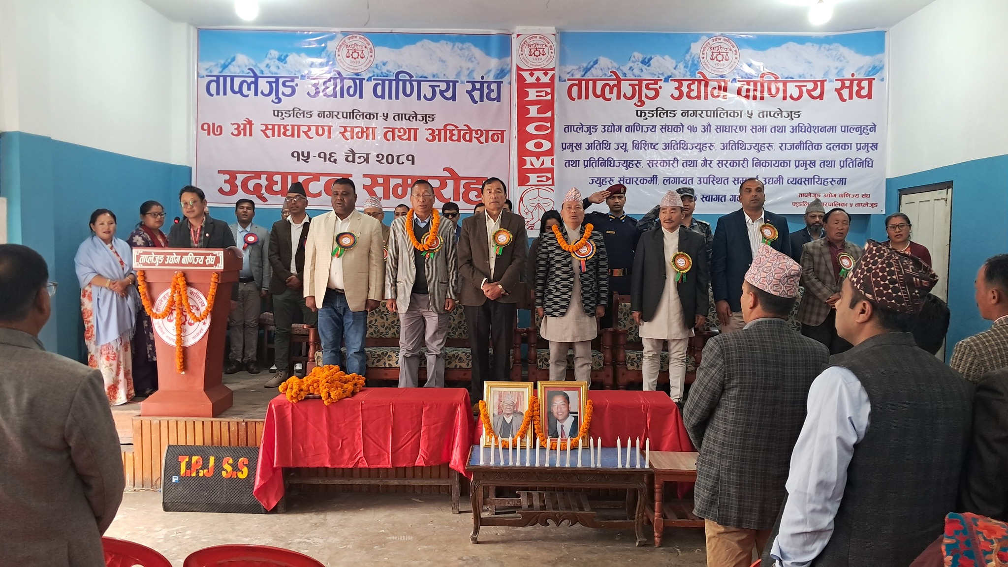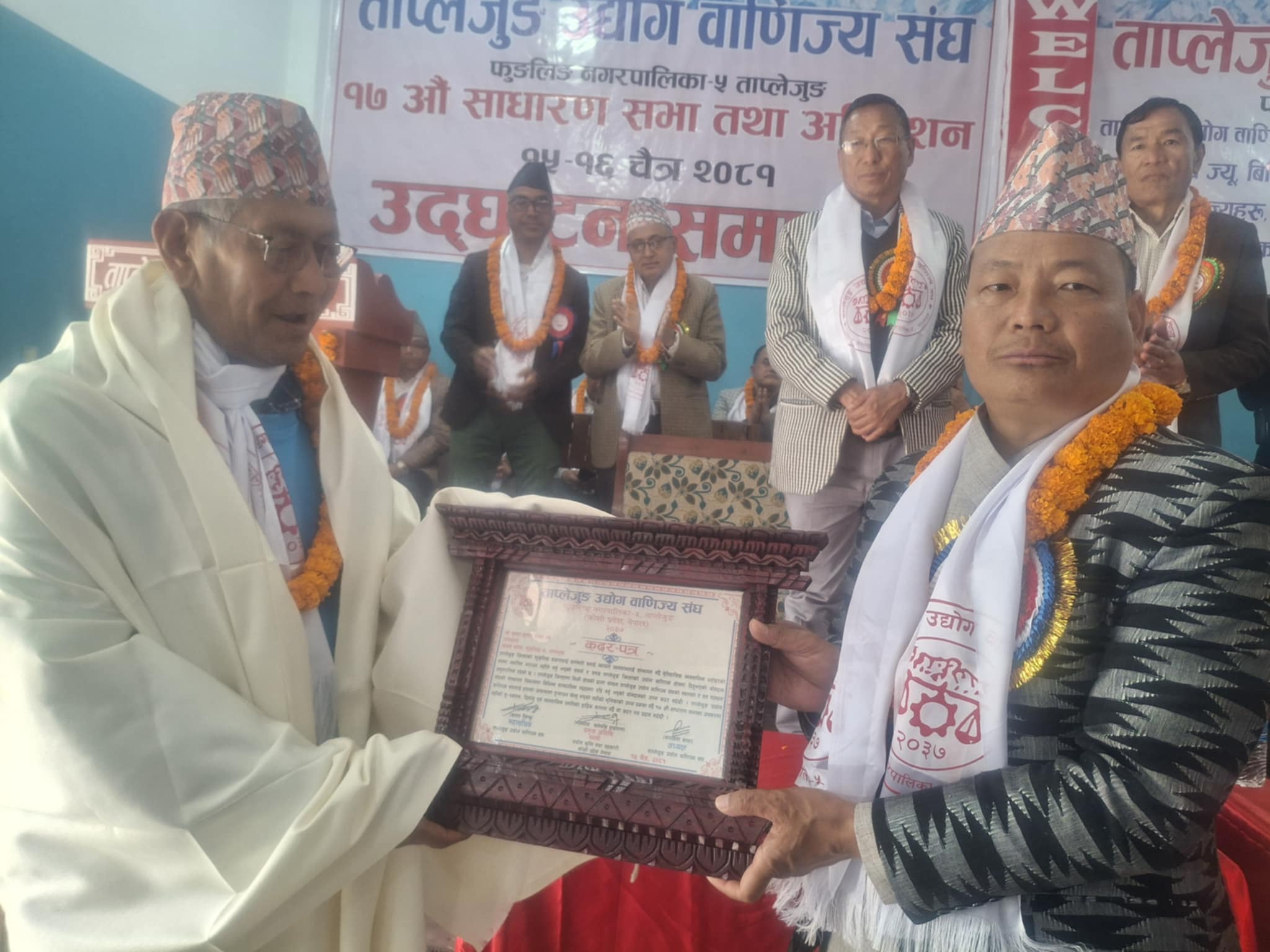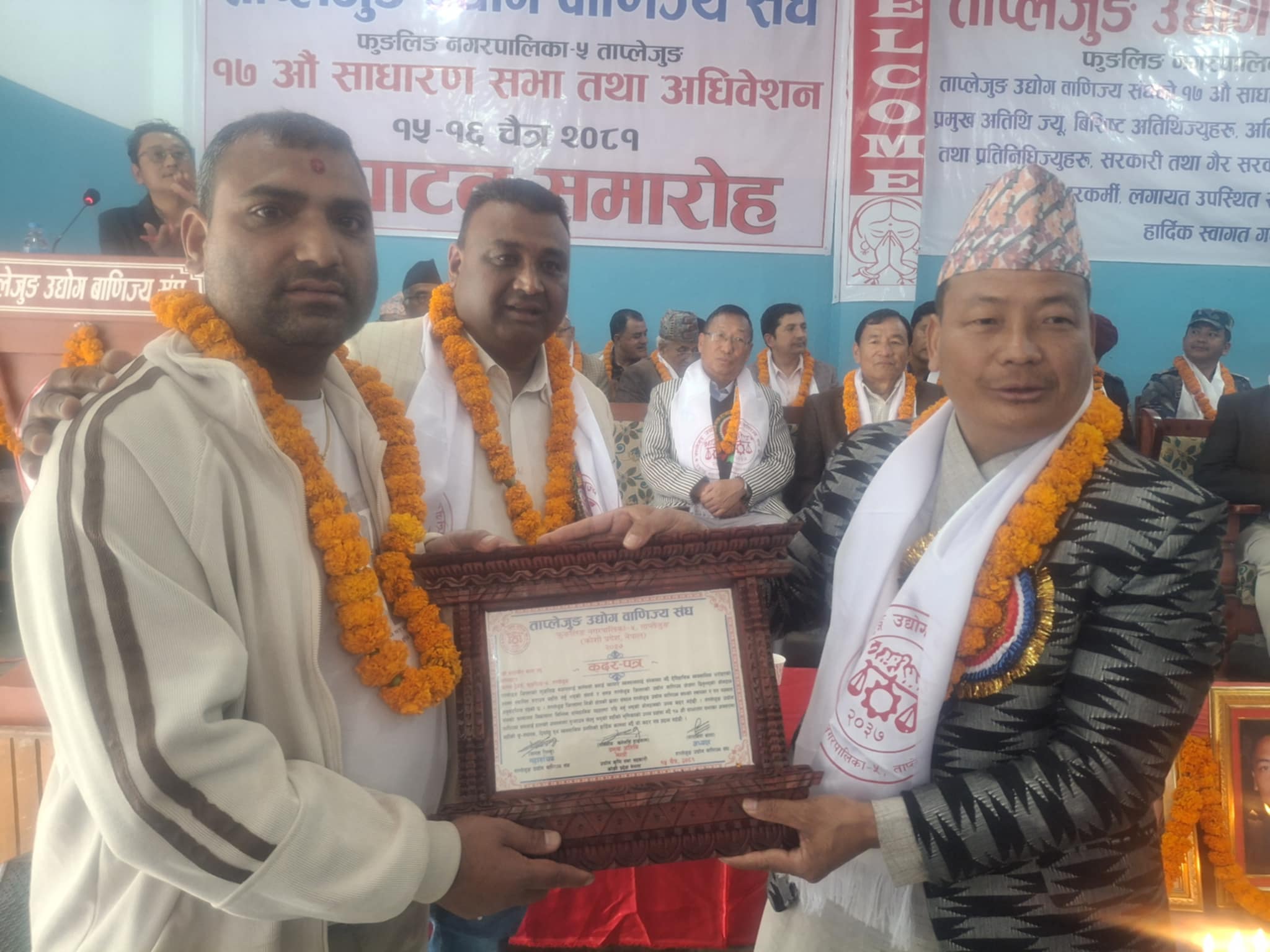 चैत १५ गते । ताप्लेजुङ उद्योग वाणिज्य सँघको शुक्रबार आयोजित १७औं साधारणसभा तथा अधिवेशनमा पुराना तीन जना व्यवसायीलाई सम्मान गरेको छ । व्यवसायी खडग मोक्तान,ताराविर थापा र कृष्ण कुमार शाक्यलाई सम्मान गरेको हो । कोशी प्रदेशका उद्योग कृषि तथा सहकारी मन्त्री खगेनसिंह हाङ्गाम र उद्योग वाणिज्य सँघ अध्यक्ष नारायण थापाले दोसल्ला ओढाएर सम्मान पत्र प्रदान गरेका हुन् ।