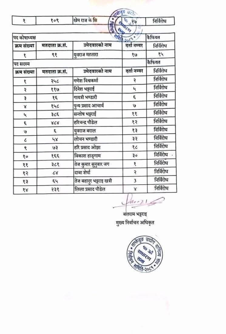 सदस्यमा सन्तोष भट्टराई, दिनेश भट्टराई, पुण्यप्रसाद आचार्य, गणेश कुमार श्रेष्ठ, गायत्री भण्डारी, नन्दकुमार बा“निया, हरिप्रसाद ओझा, लोचन भण्डारीको उम्मेद्वारी परेको थियो । यस्तै गीता भट्टराई, पिताम्वर बराल, हेमनाथ केसि, शुष्मा शाक्य, पंकजा निरौला, भोला बराल र ज्ञान प्रसाद भारतीको मनोनयन दर्ता भएको थियो । रास्वपा र माओवादीको तर्फबाट अध्यक्षमा दावा शेर्पा, द्वितीय उपाध्यक्षमा सोजित श्रेष्ठ, तृतीयमा तेजबहादुर भट्टराई र महासचिवमा लिलाप्रसाद पौडेलले मनोनयन दर्ता गराएका थिए । अध्यक्ष दावा र महासचिव पौडेल रास्वपा तथा उपाध्यक्ष सोजित र तेजबहादुर माओवादी हुन् । सदस्यमा युवराज बराल, विकास हाङगाम, गणेश लोहार, हरिचन्द्र पौडेल, रेवत श्रेष्ठ र छत्र बिकले मनोनयन दर्ता गराएका थिए ।