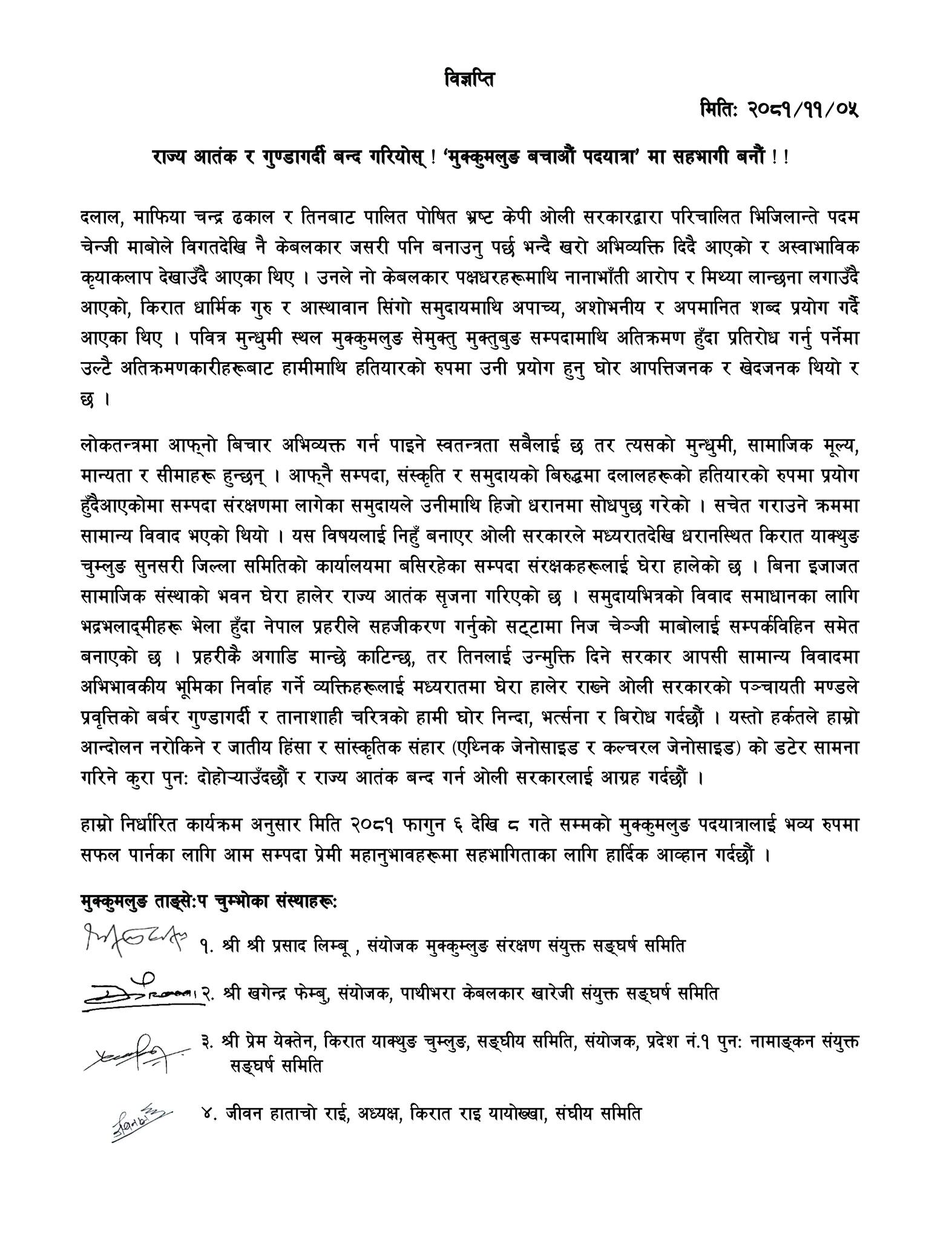 जिल्लाको प्रसिद्ध धार्मिकस्थल पाथीभरा/मुक्कुमलुङमा फागुन ६ देखि ८ गतेसम्म पैदलयात्रा कार्यक्रम तय छ । सम्पदा संरक्षणका लागि जिल्लाबाहिरबाट समेत आउन थालेका छन्