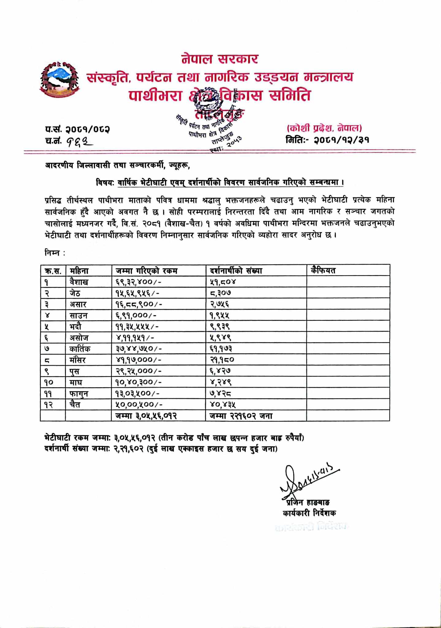 पाथीभरामा २ लाख २१ हजार दर्शनार्थी, ३ करोड ५ लाख बढि भेटी संकलन